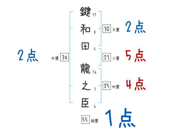 総運![]() | 鍵和田龍之臣さんの総運は55画の1つ星!欲張りな性格で軽率な行動に注意しましょう。病気に気をつけて。 あなたの人生を表す1番重要な運勢です。生涯を通じて影響する総合運となり、主に50歳以降の晩年期に影響を及ぼします。 |
