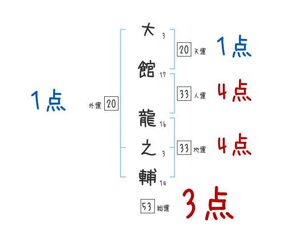 総運![]() | 大館龍之輔さんの総運は53画の3つ星!やや見栄っ張りで虚栄心がある。散財に注意。 あなたの人生を表す1番重要な運勢です。生涯を通じて影響する総合運となり、主に50歳以降の晩年期に影響を及ぼします。 |