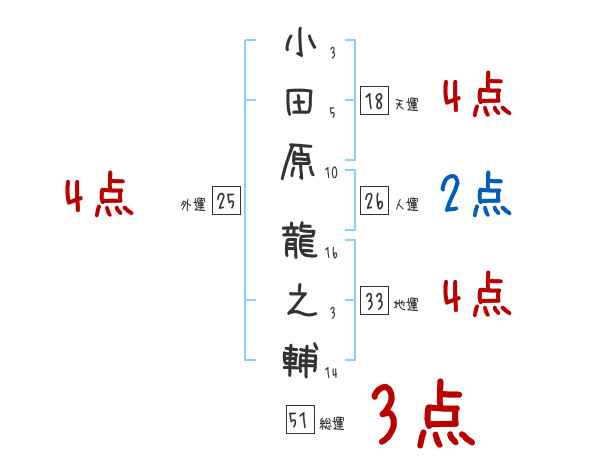 天運![]() | 小田原龍之輔さんの天運は18画の4つ星!情熱的で剛気。忍耐力があり信頼される。 家系が持つ宿命的な運勢を表します。祖先から受け継いだ苗字ですので自分の力が及びません。家柄を象徴します。 |
