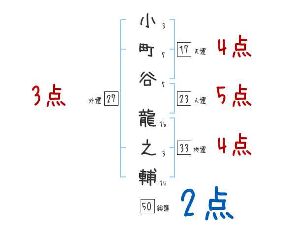 天運![]() | 小町谷龍之輔さんの天運は17画の4つ星!積極的な行動力。地位を気づき財産を手に入れる。純粋な心と直感力。 家系が持つ宿命的な運勢を表します。祖先から受け継いだ苗字ですので自分の力が及びません。家柄を象徴します。 |