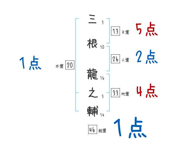 天運![]() | 三根龍之輔さんの天運は13画の5つ星!才能に恵まれ人気がある。名声を手に入れる。円満な人生。 家系が持つ宿命的な運勢を表します。祖先から受け継いだ苗字ですので自分の力が及びません。家柄を象徴します。 |