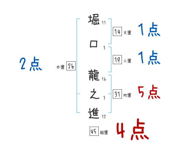 外運![]() | 堀口龍之進さんの外運は26画の2つ星!波瀾万丈かも。信頼できる人を大事にしましょう。 生活面を象徴する運勢です。外部から受ける影響力を表し、結婚運、家庭運や職場、環境への順応性を表します。 |