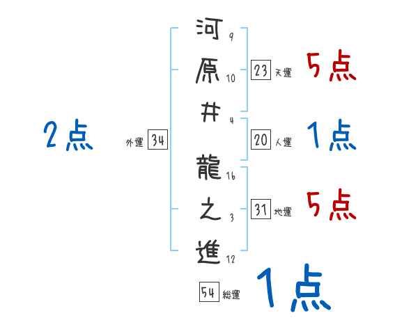 総運![]() | 河原井龍之進さんの総運は54画の1つ星!トラブルが多いかも。周りをよく見て協調して過ごしましょう。 あなたの人生を表す1番重要な運勢です。生涯を通じて影響する総合運となり、主に50歳以降の晩年期に影響を及ぼします。 |
