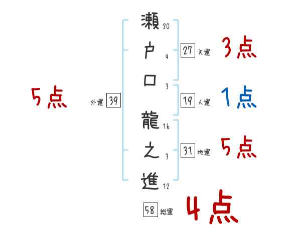 総運![]() | 瀬戸口龍之進さんの総運は58画の4つ星!安定した生活。大器晩成タイプ。 あなたの人生を表す1番重要な運勢です。生涯を通じて影響する総合運となり、主に50歳以降の晩年期に影響を及ぼします。 |