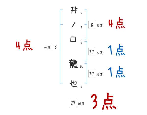 天運![]() | 井ノ口龍也さんの天運は8画の4つ星!勤勉家。根気強く努力し成功する。忍耐力がある。 家系が持つ宿命的な運勢を表します。祖先から受け継いだ苗字ですので自分の力が及びません。家柄を象徴します。 |