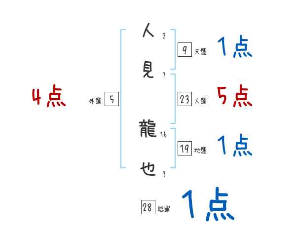 天運![]() | 人見龍也さんの天運は9画の1つ星!消極的で才能を発揮することが苦手なことも。周りの意見に耳を傾けましょう。 家系が持つ宿命的な運勢を表します。祖先から受け継いだ苗字ですので自分の力が及びません。家柄を象徴します。 |