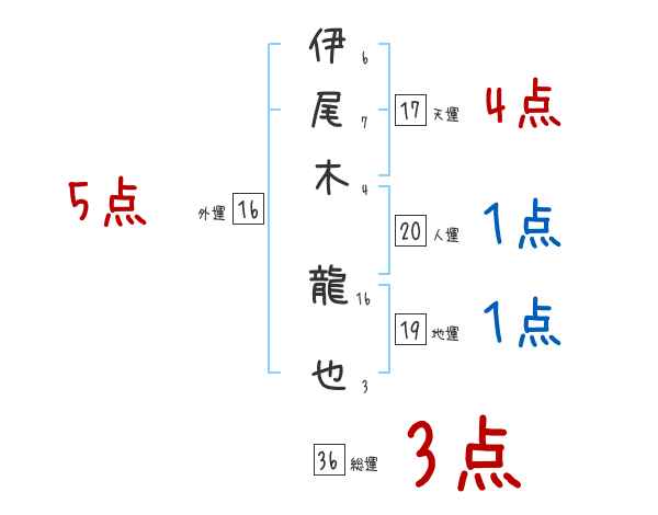 総運![]() | 伊尾木龍也さんの総運は36画の3つ星!先見性が豊かです。多少神経質で苦労することも。 あなたの人生を表す1番重要な運勢です。生涯を通じて影響する総合運となり、主に50歳以降の晩年期に影響を及ぼします。 |