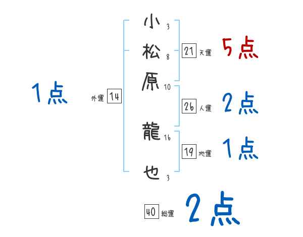 外運![]() | 小松原龍也さんの外運は14画の1つ星!人に対して優しいがストレスを溜め込みがち。人間関係のトラブルを避けるよう気をつけましょう。 生活面を象徴する運勢です。外部から受ける影響力を表し、結婚運、家庭運や職場、環境への順応性を表します。 |
