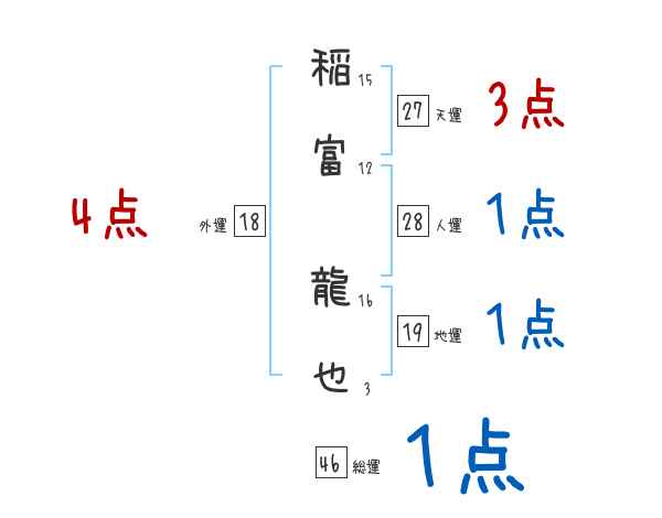 天運![]() | 稲富龍也さんの天運は27画の3つ星!頭脳明晰だが強情で摩擦が多い傾向。孤立に注意。 家系が持つ宿命的な運勢を表します。祖先から受け継いだ苗字ですので自分の力が及びません。家柄を象徴します。 |