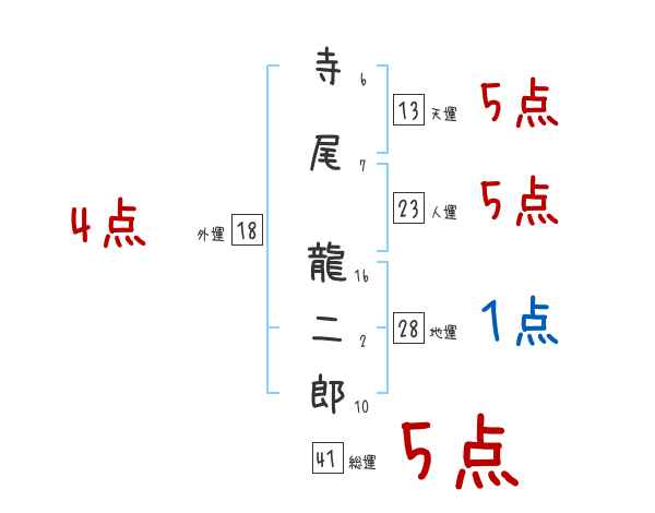 人運![]() | 寺尾龍二郎さんの人運は23画の5つ星!想像力に優れ活力がある。一代で成功し名誉を手に入れる。 性格や才能などを表す2番目に重要な運勢です。人間関係や協調性、社会的な成功に影響します。主に20歳から50歳ぐらいまでの中年期の運勢を表します。 |