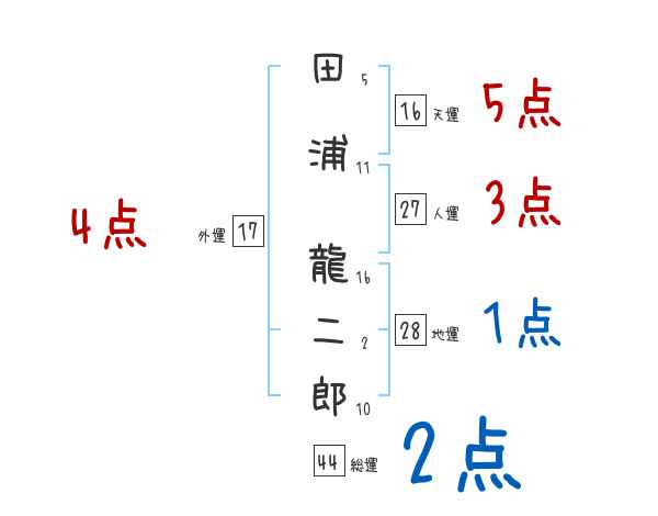 外運![]() | 田浦龍二郎さんの外運は17画の4つ星!積極的な行動力。地位を気づき財産を手に入れる。純粋な心と直感力。 生活面を象徴する運勢です。外部から受ける影響力を表し、結婚運、家庭運や職場、環境への順応性を表します。 |