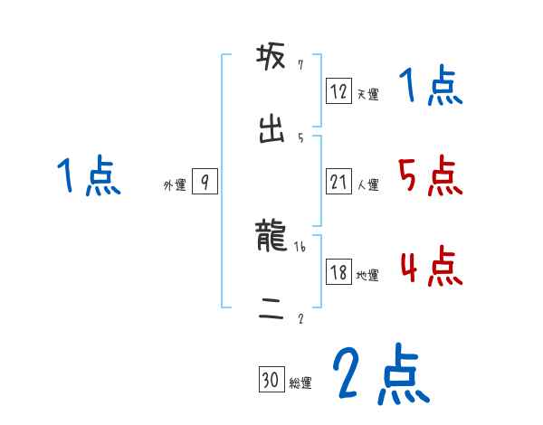 人運![]() | 坂出龍二さんの人運は21画の5つ星!統率力がある。独立し成功する。名誉を手に入れる。 性格や才能などを表す2番目に重要な運勢です。人間関係や協調性、社会的な成功に影響します。主に20歳から50歳ぐらいまでの中年期の運勢を表します。 |
