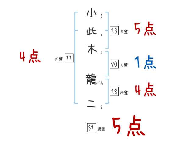 総運![]() | 小此木龍二さんの総運は31画の5つ星!社交性があり判断力に優れる。順風満帆な人生で円満な生活。 あなたの人生を表す1番重要な運勢です。生涯を通じて影響する総合運となり、主に50歳以降の晩年期に影響を及ぼします。 |