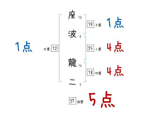 天運![]() | 座波龍二さんの天運は19画の1つ星!優れた才能を持ちますが、協調性が足りないことも。周りの人と協力する事を意識しましょう。 家系が持つ宿命的な運勢を表します。祖先から受け継いだ苗字ですので自分の力が及びません。家柄を象徴します。 |