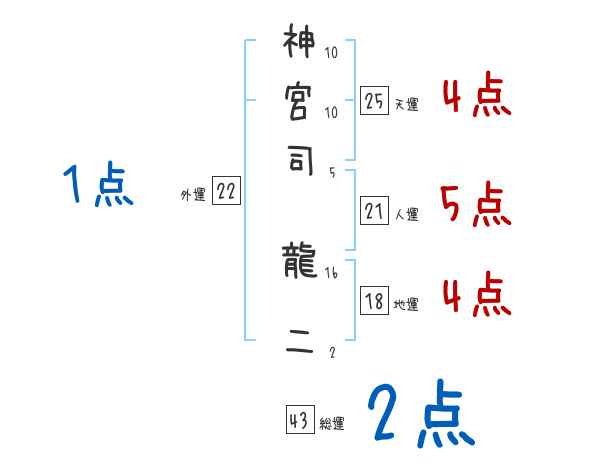 外運![]() | 神宮司龍二さんの外運は22画の1つ星!努力することが苦手ないっぽう手先が器用。芸術性にも優れる。 生活面を象徴する運勢です。外部から受ける影響力を表し、結婚運、家庭運や職場、環境への順応性を表します。 |