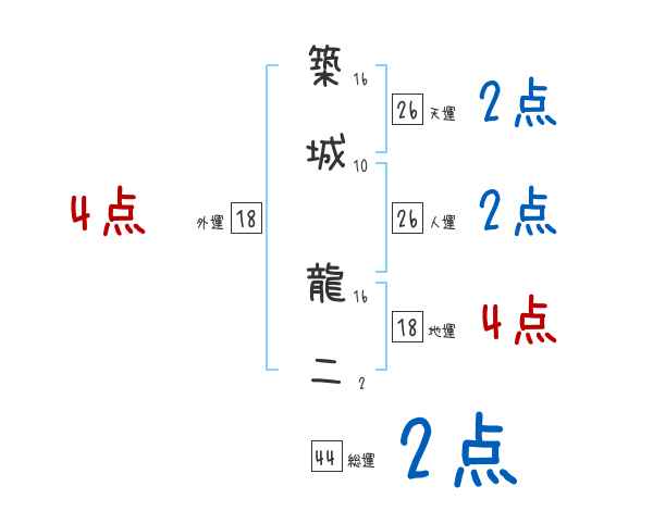 総運![]() | 築城龍二さんの総運は44画の2つ星!誠実で慎重な性格。物事を考えすぎないように注意しましょう。 あなたの人生を表す1番重要な運勢です。生涯を通じて影響する総合運となり、主に50歳以降の晩年期に影響を及ぼします。 |