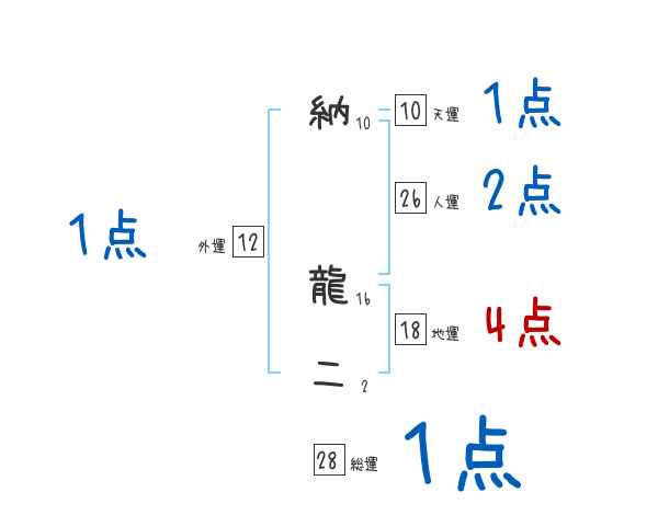 天運![]() | 納龍二さんの天運は10画の1つ星!不安を感じやすい傾向。ストレスを抱えないように注意しましょう。 家系が持つ宿命的な運勢を表します。祖先から受け継いだ苗字ですので自分の力が及びません。家柄を象徴します。 |