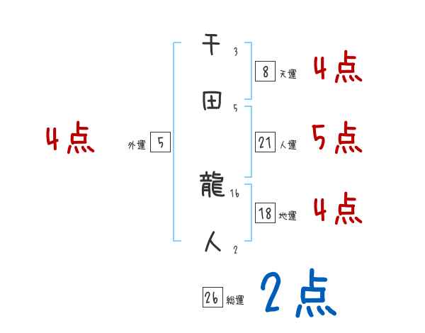天運![]() | 千田龍人さんの天運は8画の4つ星!勤勉家。根気強く努力し成功する。忍耐力がある。 家系が持つ宿命的な運勢を表します。祖先から受け継いだ苗字ですので自分の力が及びません。家柄を象徴します。 |