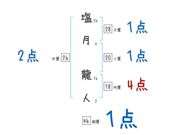 天運![]() | 塩月龍人さんの天運は28画の1つ星!家庭環境に注意。スポーツで活躍できる能力があるかも。 家系が持つ宿命的な運勢を表します。祖先から受け継いだ苗字ですので自分の力が及びません。家柄を象徴します。 |