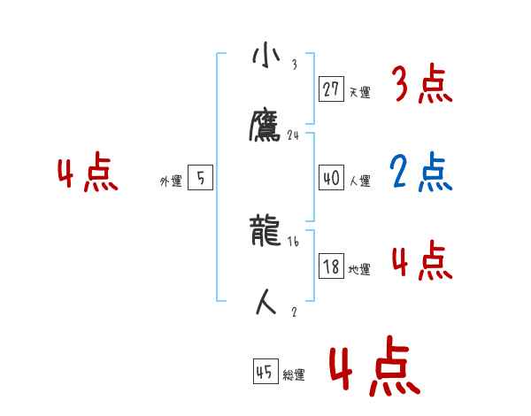 天運![]() | 小鷹龍人さんの天運は27画の3つ星!頭脳明晰だが強情で摩擦が多い傾向。孤立に注意。 家系が持つ宿命的な運勢を表します。祖先から受け継いだ苗字ですので自分の力が及びません。家柄を象徴します。 |
