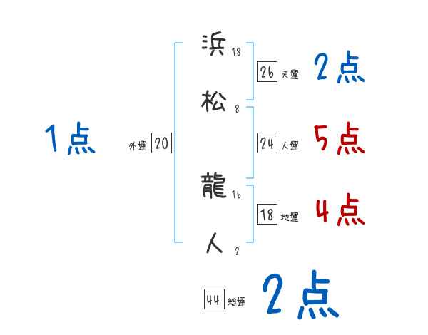 総運![]() | 浜松龍人さんの総運は44画の2つ星!誠実で慎重な性格。物事を考えすぎないように注意しましょう。 あなたの人生を表す1番重要な運勢です。生涯を通じて影響する総合運となり、主に50歳以降の晩年期に影響を及ぼします。 |