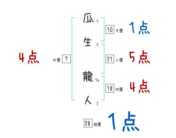 人運![]() | 瓜生龍人さんの人運は21画の5つ星!統率力がある。独立し成功する。名誉を手に入れる。 性格や才能などを表す2番目に重要な運勢です。人間関係や協調性、社会的な成功に影響します。主に20歳から50歳ぐらいまでの中年期の運勢を表します。 |
