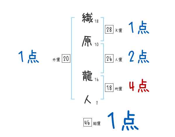 天運![]() | 織原龍人さんの天運は28画の1つ星!家庭環境に注意。スポーツで活躍できる能力があるかも。 家系が持つ宿命的な運勢を表します。祖先から受け継いだ苗字ですので自分の力が及びません。家柄を象徴します。 |