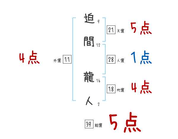 総運![]() | 迫間龍人さんの総運は39画の5つ星!社交性に優れ人望が厚い。人の上に立ち成功する。 あなたの人生を表す1番重要な運勢です。生涯を通じて影響する総合運となり、主に50歳以降の晩年期に影響を及ぼします。 |