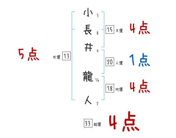 総運![]() | 小長井龍人さんの総運は33画の4つ星!権力志向でプライドが高い。勇気があり運を切り開き成功する。 あなたの人生を表す1番重要な運勢です。生涯を通じて影響する総合運となり、主に50歳以降の晩年期に影響を及ぼします。 |