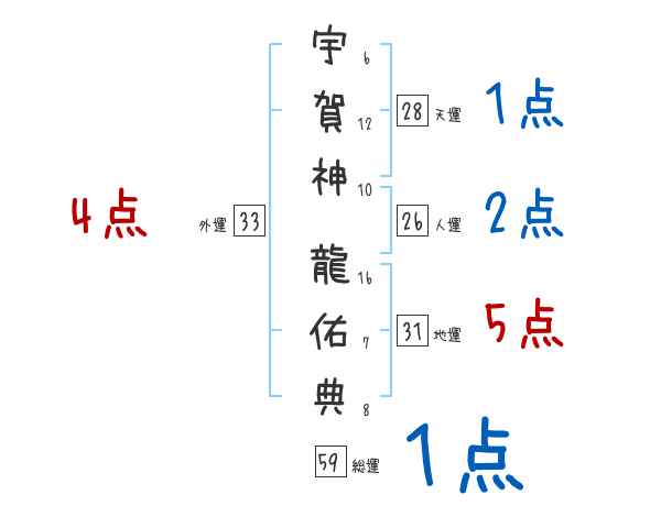 宇賀神龍佑典さんの画数の鑑定結果