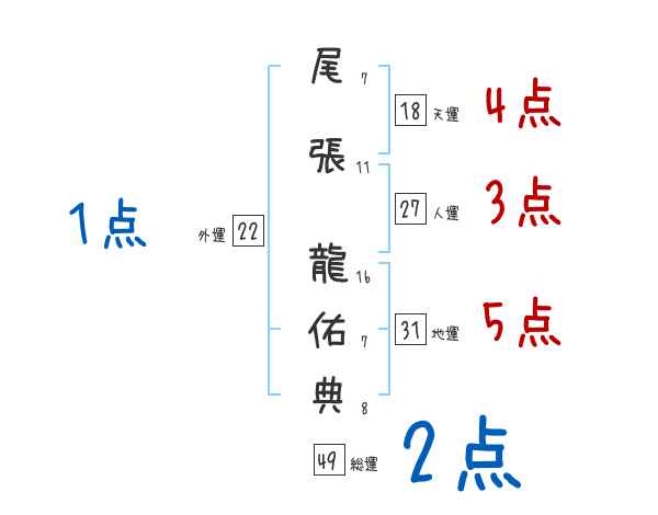 地運![]() | 尾張龍佑典さんの地運は31画の5つ星!社交性があり判断力に優れる。順風満帆な人生で円満な生活。 個性を表す基礎的な運勢です。性格形成や対人関係、行動力など家庭環境に影響されます。主に誕生してから20歳くらいまでの若年期の運勢を表します。 |