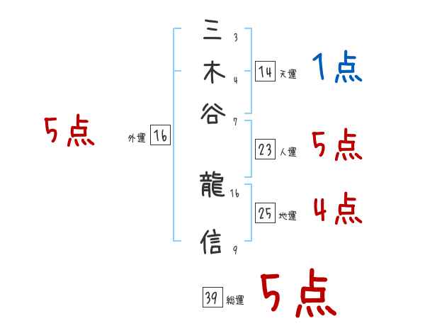 外運![]() | 三木谷龍信さんの外運は16画の5つ星!人望が厚く大きく発展する。逆転成功が見える。 生活面を象徴する運勢です。外部から受ける影響力を表し、結婚運、家庭運や職場、環境への順応性を表します。 |