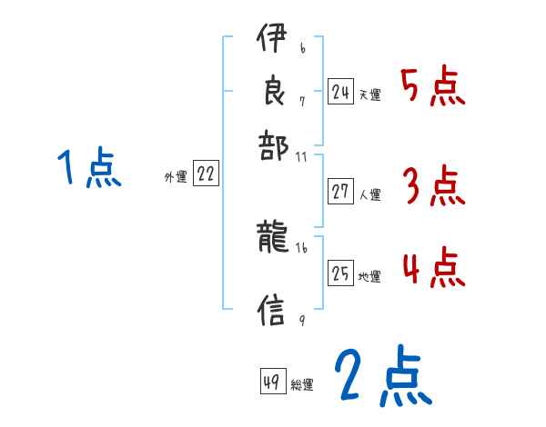 天運![]() | 伊良部龍信さんの天運は24画の5つ星!家庭運が良く順調な人生。金運にも恵まれる。 家系が持つ宿命的な運勢を表します。祖先から受け継いだ苗字ですので自分の力が及びません。家柄を象徴します。 |