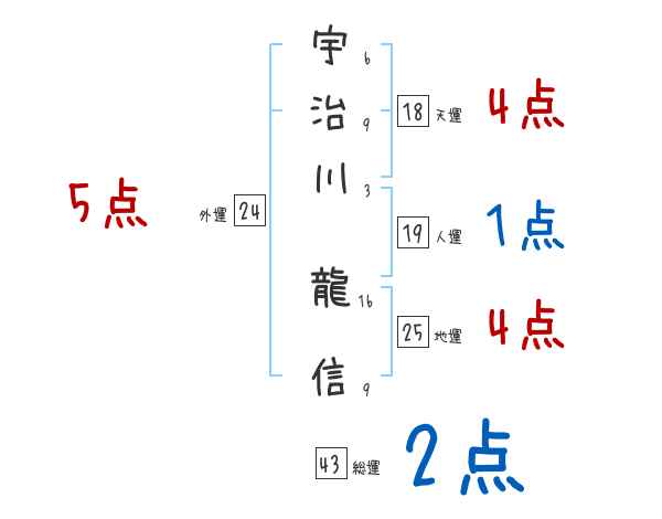 外運![]() | 宇治川龍信さんの外運は24画の5つ星!家庭運が良く順調な人生。金運にも恵まれる。 生活面を象徴する運勢です。外部から受ける影響力を表し、結婚運、家庭運や職場、環境への順応性を表します。 |