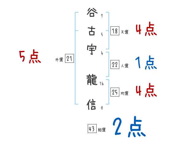 天運![]() | 谷古宇龍信さんの天運は18画の4つ星!情熱的で剛気。忍耐力があり信頼される。 家系が持つ宿命的な運勢を表します。祖先から受け継いだ苗字ですので自分の力が及びません。家柄を象徴します。 |