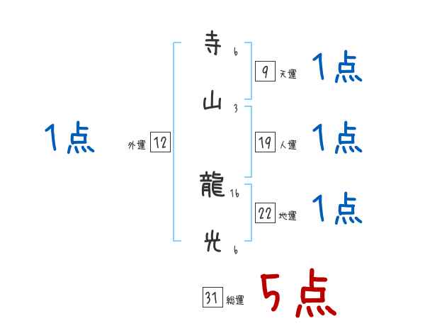 天運![]() | 寺山龍光さんの天運は9画の1つ星!消極的で才能を発揮することが苦手なことも。周りの意見に耳を傾けましょう。 家系が持つ宿命的な運勢を表します。祖先から受け継いだ苗字ですので自分の力が及びません。家柄を象徴します。 |