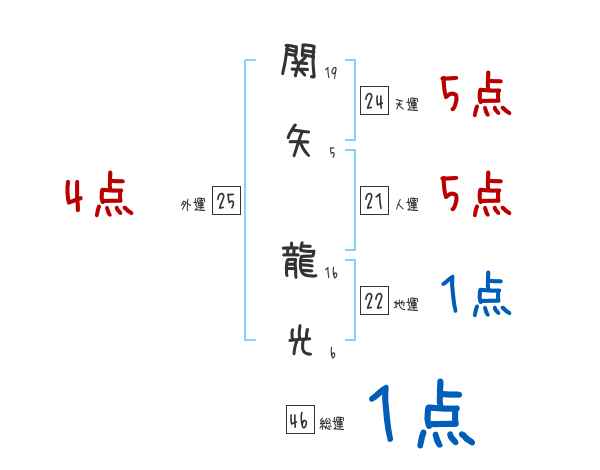 天運![]() | 関矢龍光さんの天運は24画の5つ星!家庭運が良く順調な人生。金運にも恵まれる。 家系が持つ宿命的な運勢を表します。祖先から受け継いだ苗字ですので自分の力が及びません。家柄を象徴します。 |