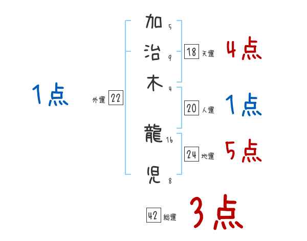 天運![]() | 加治木龍児さんの天運は18画の4つ星!情熱的で剛気。忍耐力があり信頼される。 家系が持つ宿命的な運勢を表します。祖先から受け継いだ苗字ですので自分の力が及びません。家柄を象徴します。 |