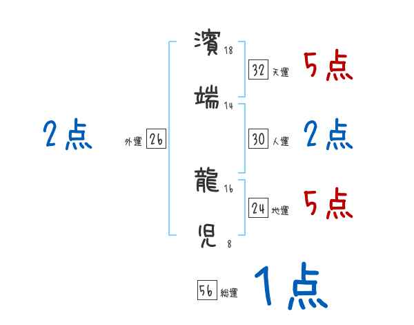 天運![]() | 濱端龍児さんの天運は32画の5つ星!柔軟性があり成功する。チャンスが多く金運が良い。 家系が持つ宿命的な運勢を表します。祖先から受け継いだ苗字ですので自分の力が及びません。家柄を象徴します。 |