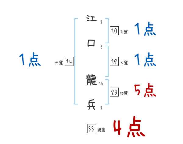 外運![]() | 江口龍兵さんの外運は14画の1つ星!人に対して優しいがストレスを溜め込みがち。人間関係のトラブルを避けるよう気をつけましょう。 生活面を象徴する運勢です。外部から受ける影響力を表し、結婚運、家庭運や職場、環境への順応性を表します。 |
