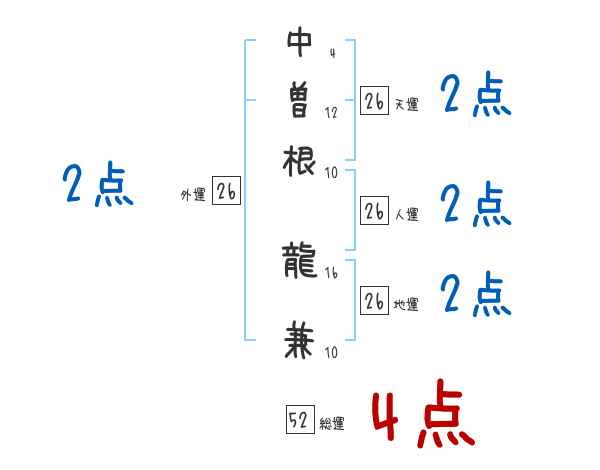 外運![]() | 中曽根龍兼さんの外運は26画の2つ星!波瀾万丈かも。信頼できる人を大事にしましょう。 生活面を象徴する運勢です。外部から受ける影響力を表し、結婚運、家庭運や職場、環境への順応性を表します。 |