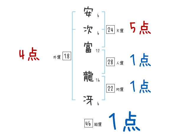 天運![]() | 安次富龍冴さんの天運は24画の5つ星!家庭運が良く順調な人生。金運にも恵まれる。 家系が持つ宿命的な運勢を表します。祖先から受け継いだ苗字ですので自分の力が及びません。家柄を象徴します。 |