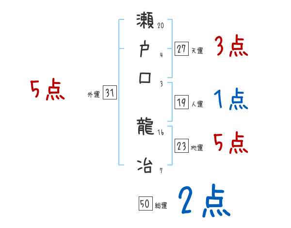 外運![]() | 瀬戸口龍冶さんの外運は31画の5つ星!社交性があり判断力に優れる。順風満帆な人生で円満な生活。 生活面を象徴する運勢です。外部から受ける影響力を表し、結婚運、家庭運や職場、環境への順応性を表します。 |
