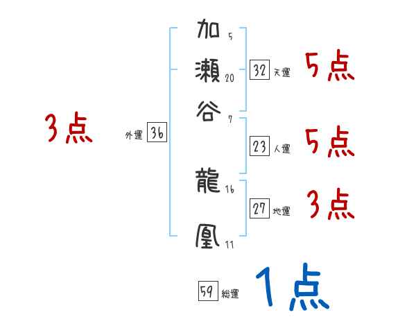 外運![]() | 加瀬谷龍凰さんの外運は36画の3つ星!先見性が豊かです。多少神経質で苦労することも。 生活面を象徴する運勢です。外部から受ける影響力を表し、結婚運、家庭運や職場、環境への順応性を表します。 |