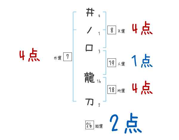 天運![]() | 井ノ口龍刀さんの天運は8画の4つ星!勤勉家。根気強く努力し成功する。忍耐力がある。 家系が持つ宿命的な運勢を表します。祖先から受け継いだ苗字ですので自分の力が及びません。家柄を象徴します。 |