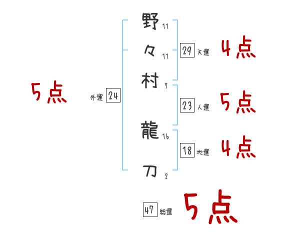 天運![]() | 野々村龍刀さんの天運は29画の4つ星!完全主義で才能がある。厳格な心の持ち主。 家系が持つ宿命的な運勢を表します。祖先から受け継いだ苗字ですので自分の力が及びません。家柄を象徴します。 |