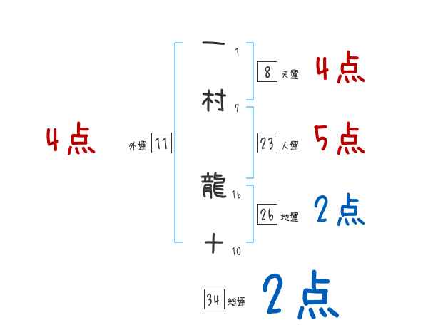 総運![]() | 一村龍十さんの総運は34画の2つ星!独創性に優れるが、自尊心が強く災難に注意しましょう。 あなたの人生を表す1番重要な運勢です。生涯を通じて影響する総合運となり、主に50歳以降の晩年期に影響を及ぼします。 |
