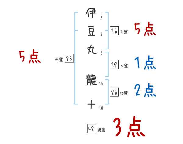総運![]() | 伊豆丸龍十さんの総運は42画の3つ星!病気に注意。多芸であるが消極的でおとなしい。 あなたの人生を表す1番重要な運勢です。生涯を通じて影響する総合運となり、主に50歳以降の晩年期に影響を及ぼします。 |