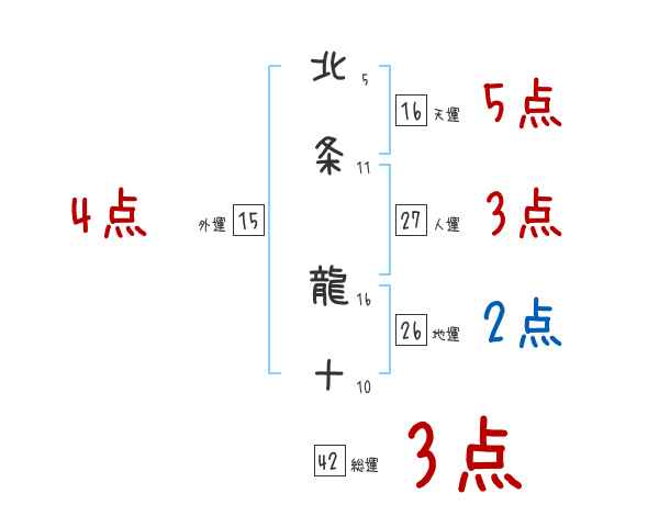 天運![]() | 北条龍十さんの天運は16画の5つ星!人望が厚く大きく発展する。逆転成功が見える。 家系が持つ宿命的な運勢を表します。祖先から受け継いだ苗字ですので自分の力が及びません。家柄を象徴します。 |