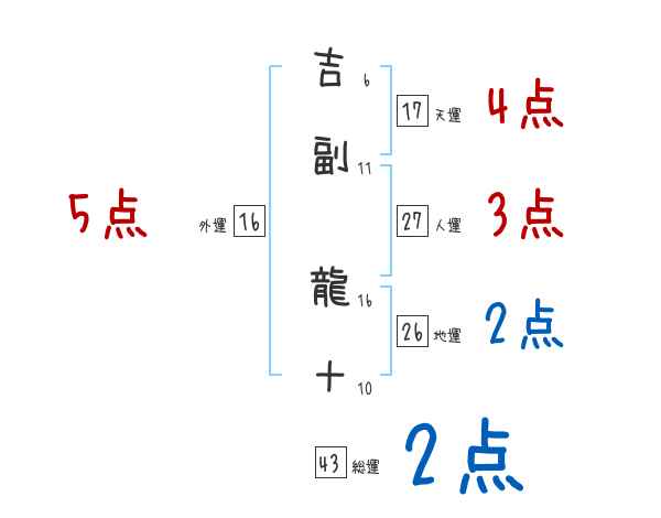 総運![]() | 吉副龍十さんの総運は43画の2つ星!頑固な性格で独立心が強いかも。やや非現実的で浪費に注意しましょう。 あなたの人生を表す1番重要な運勢です。生涯を通じて影響する総合運となり、主に50歳以降の晩年期に影響を及ぼします。 |